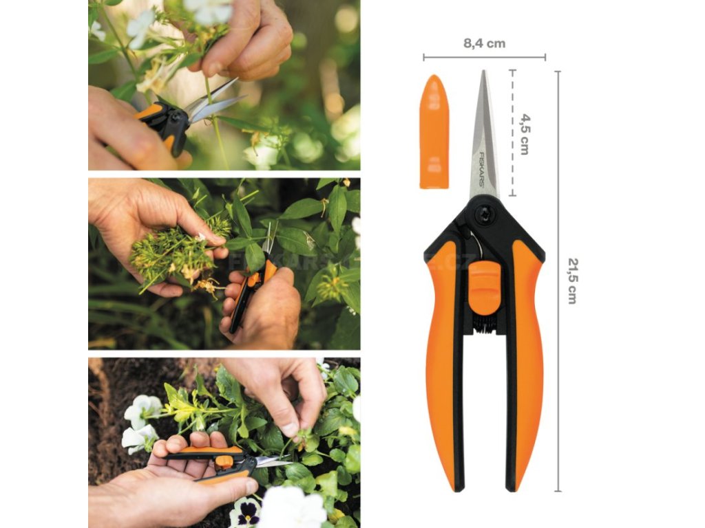 - Precizní střih: špičaté nerezové čepele s Micro-Tip výbrusem řežou čistě až do špičky – ideální pro detailní prostřihávání bylinek, květin a mladých výhonů.