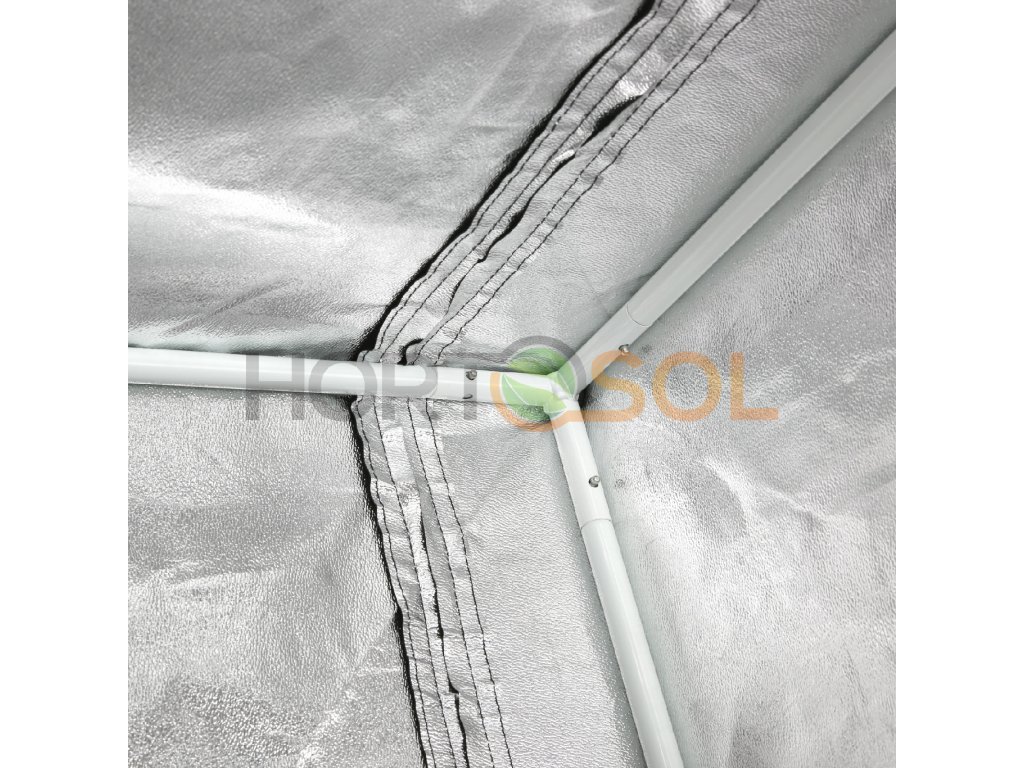 Veškeré trubky, rohové spojky a držáky jsou vyrobeny z 16mm kovu, aby bylo možné na ně bez obav připevnit příslušenství s větší hmotností. Díky stabilní konstrukci nedochází k nebezpečnému prověšování tyčí. V zájmu zajištění bezpečné a bezproblémové montáže a dobré stability jsou všechny rohové spojky a tyče opatřeny zacvakávacím systémem. Konstrukce střechy pěstebního boxu má navíc příčné vzpěry, které umožňují připevnění ventilátorů, filtrů nebo osvětlovacích systémů.Materiál potahu pěstebních boxů HORTOSOL je vyroben z kvalitní stabilní tkaniny Oxford a vnitřek je vyložen vysoce reflexní stříbrnou fólií, která redukuje průnik tepla na minimum. Oddělitelná stříbrná podlaha je vodotěsná a usnadňuje pozdější čištění.
