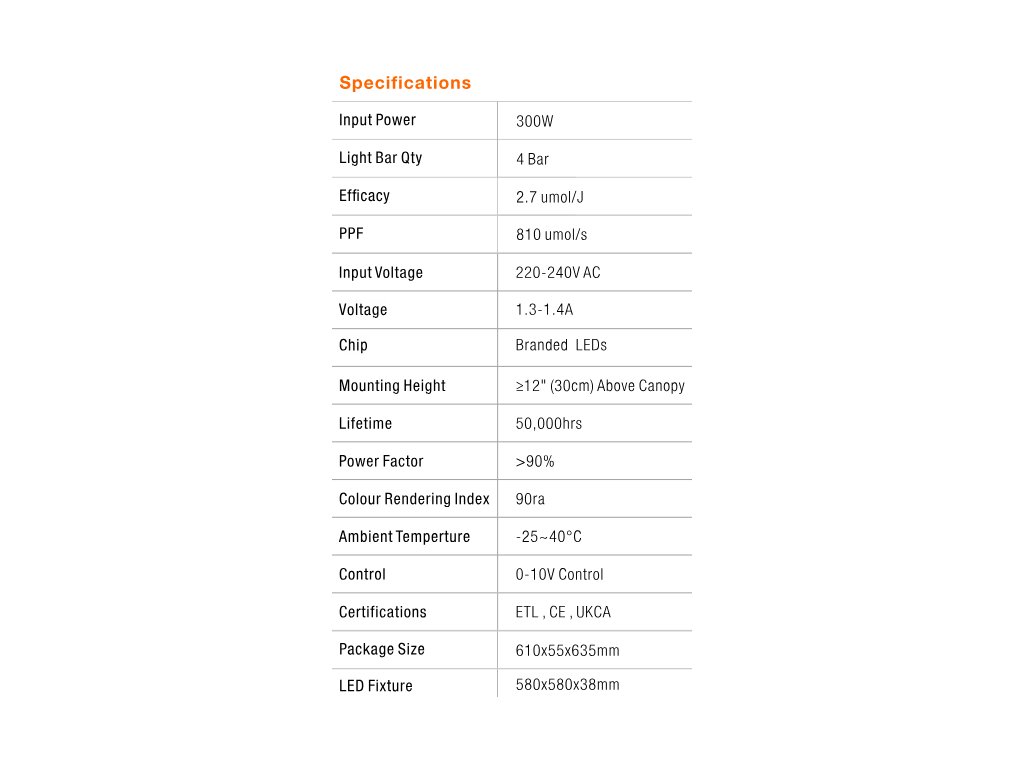 - 300 W | účinnost 2,7 µmol/J | PPF 810 µmol/s