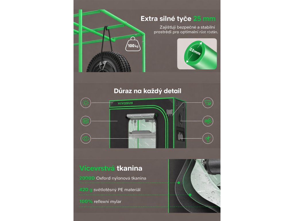 Ocelové tyče Ø22 mm zvyšují stabilitu a výrobce uvádí nosnost konstrukce 220 lb (≈ 100 kg). Součástí je i výztužný “High CFM kit”, který pomáhá omezit deformace při použití silnější ventilace a zároveň usnadňuje uchycení trellis sítě.