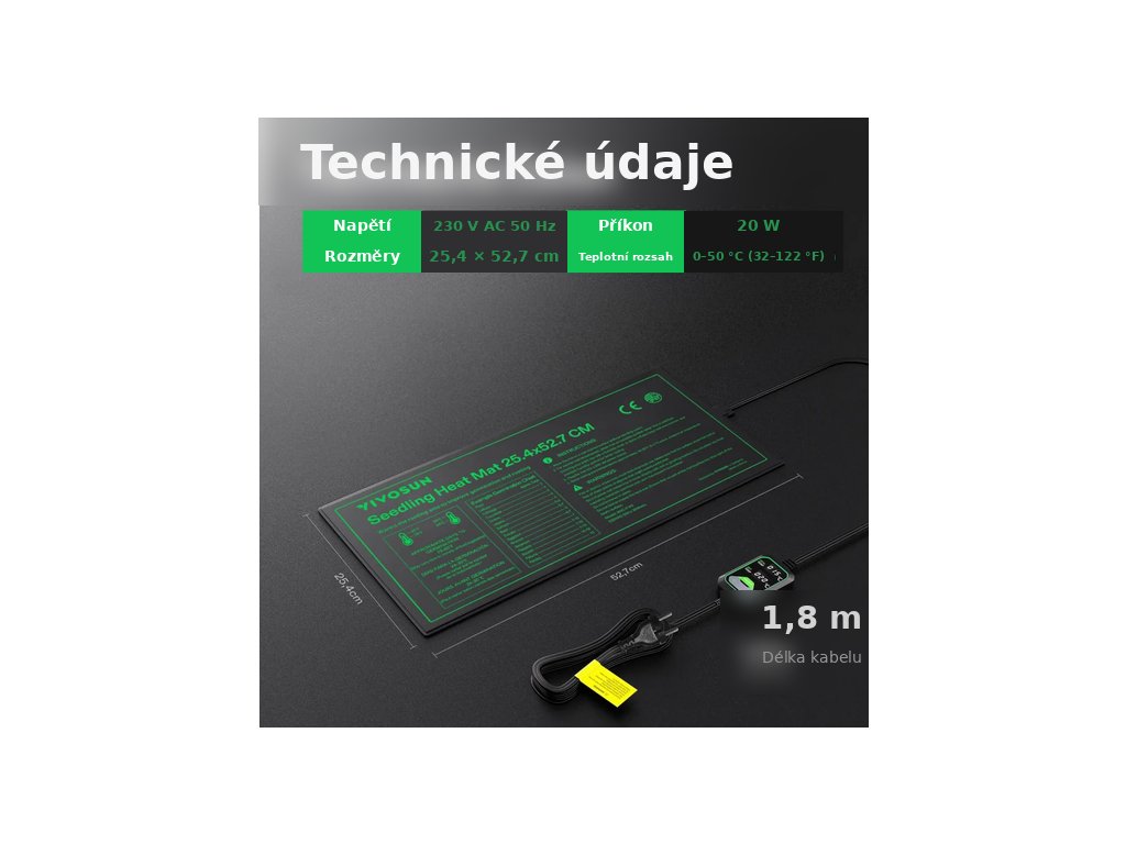 VIVOSUN Heat Mat s Dual Digital Display je výhřevná podložka s integrovaným termostatem pro klíčení semen a zakořeňování řízků. Nastavíš cílovou teplotu, na displeji zároveň vidíš SET TEMP (nastavená) a REAL TEMP (aktuální) – a tím držíš kořenovou zónu přesně tam, kde ji chceš.