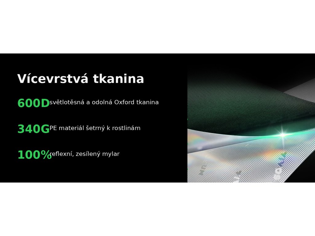 - Světlotěsnost a odraz: 600D tkanina + 100% Mylar pomáhají držet světlo uvnitř a zlepšují využití osvětlení.