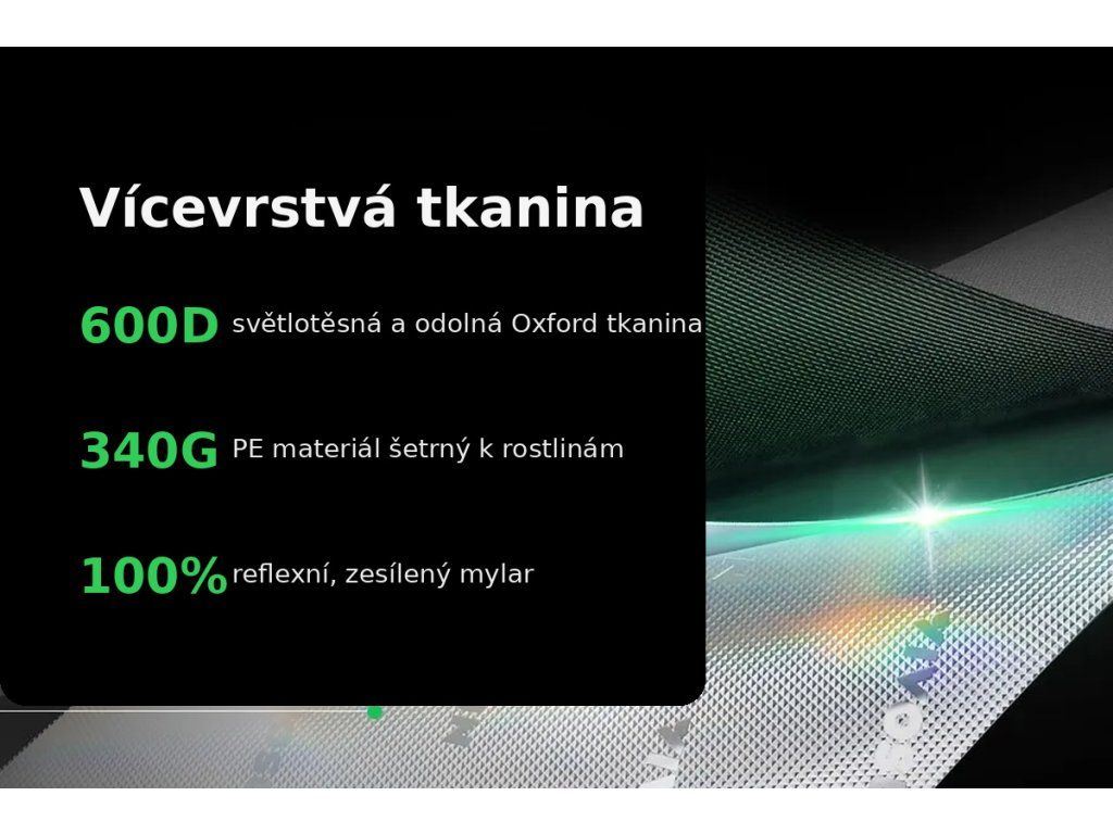600D Oxford plátno je doplněné vnitřní PE vrstvou a 100% reflexním Mylar povrchem. Zip je doplněný černým vnitřním lemem, aby se omezily úniky světla – v praxi velmi užitečné hlavně ve fázi květu.