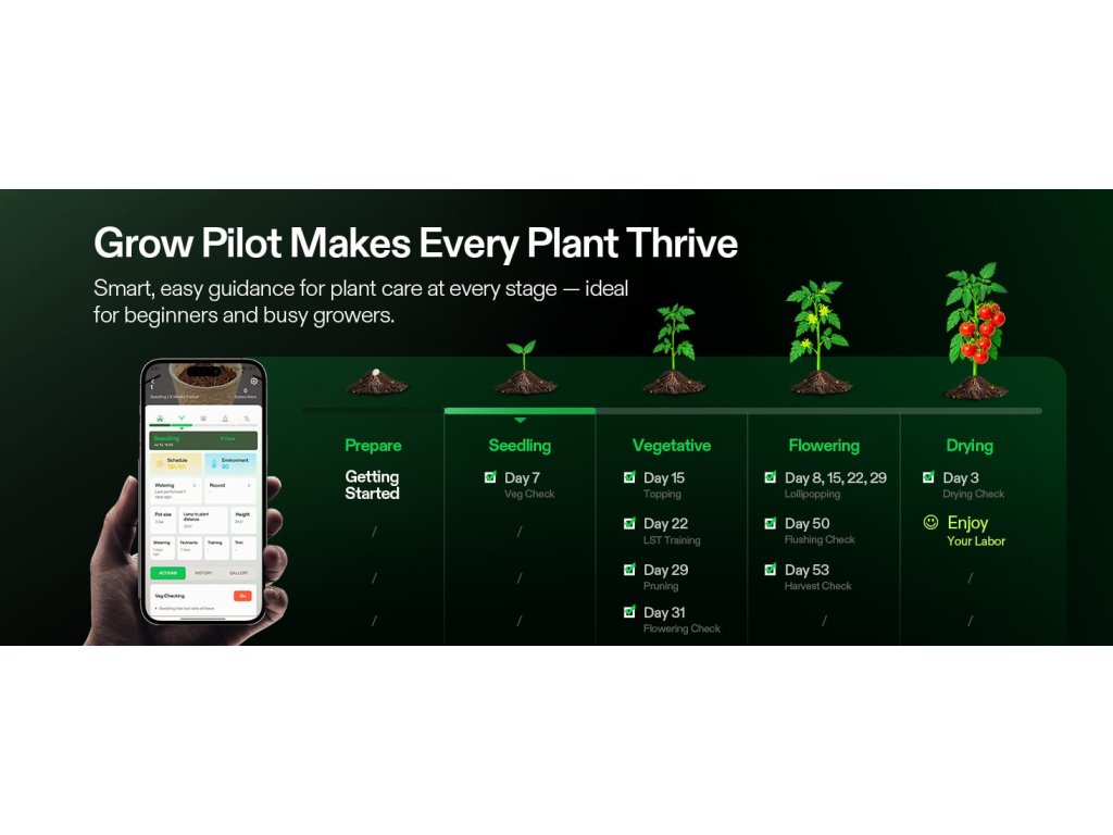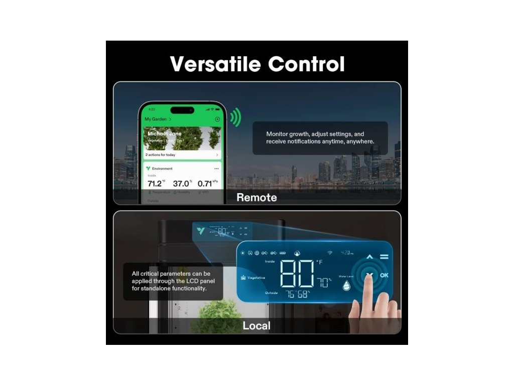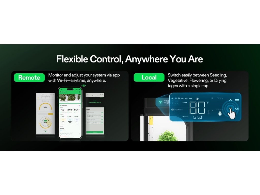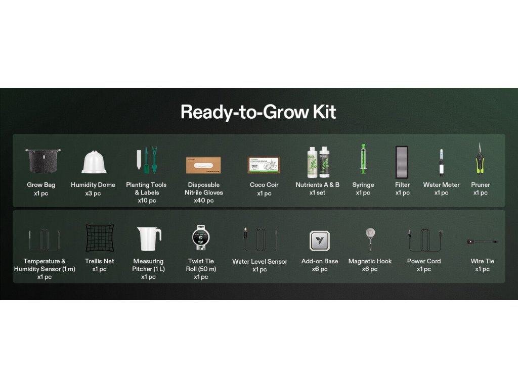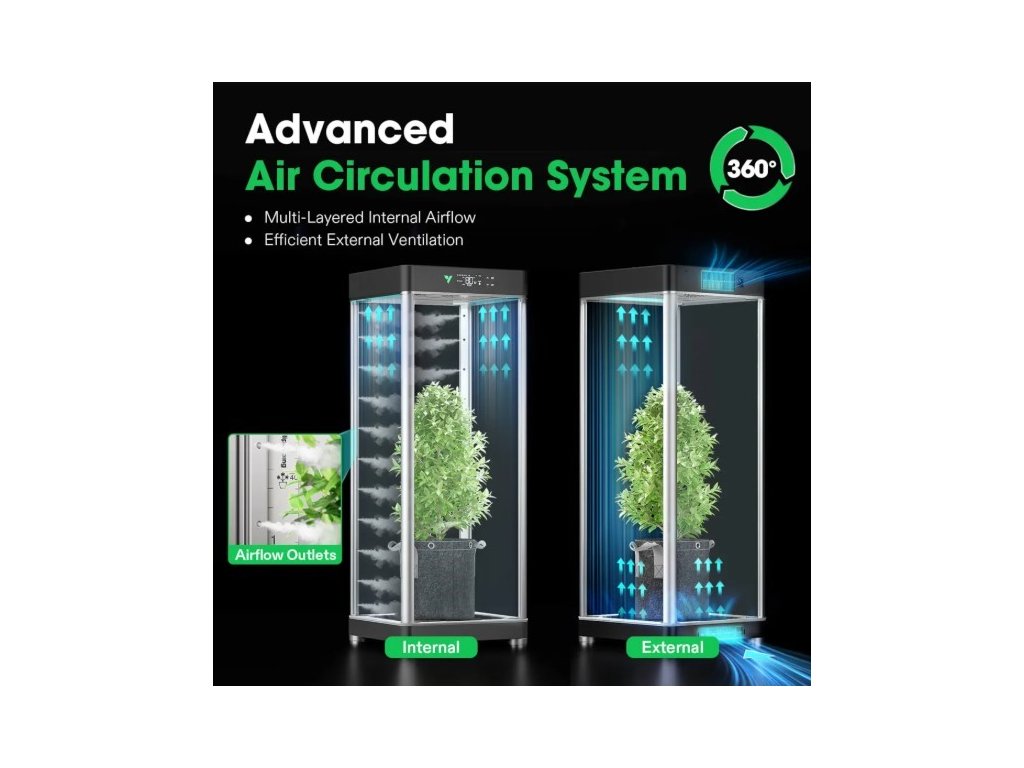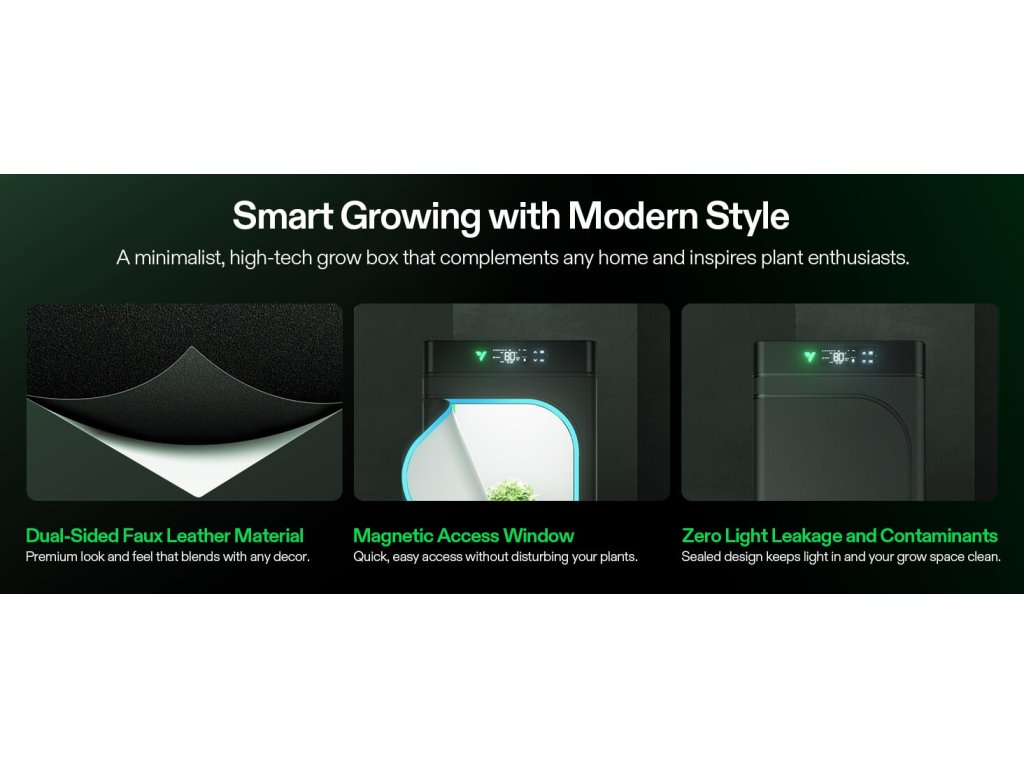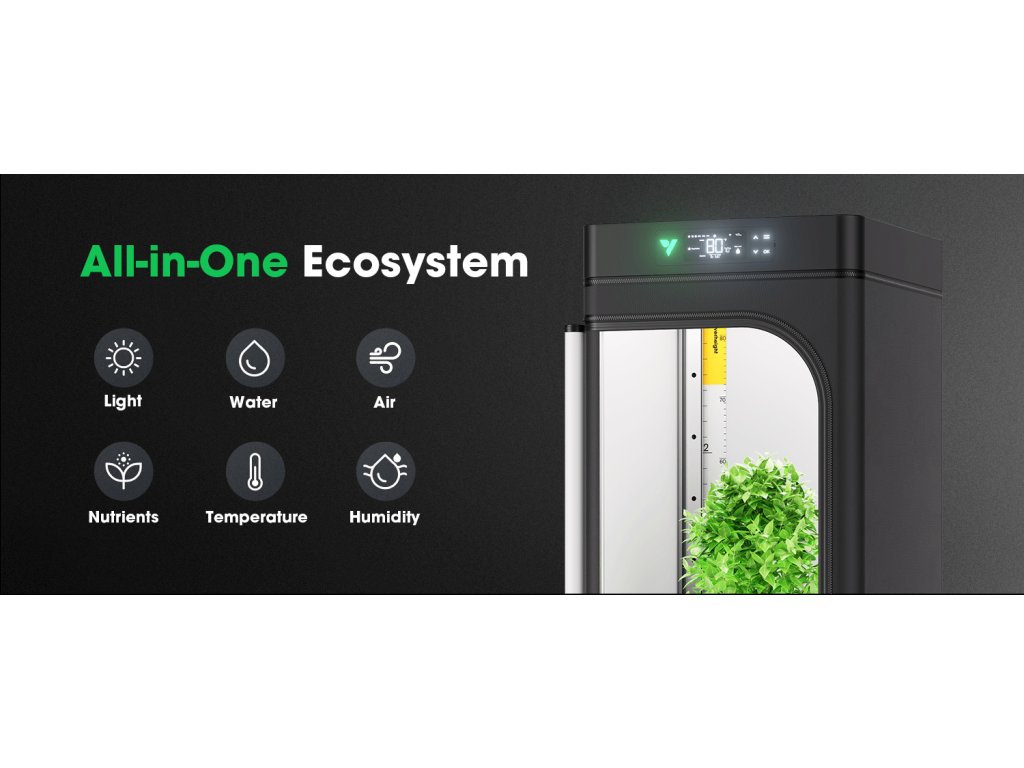 VGrow je uzavřený pěstební systém pro domácí prostředí. V jednom kompaktním boxu kombinuje osvětlení, ventilaci, cirkulaci vzduchu, filtraci zápachu a samo-zavlažování. Nastavení zvládneš přes aplikaci (Wi-Fi 2.4G) nebo přímo na lokálním LCD panelu.