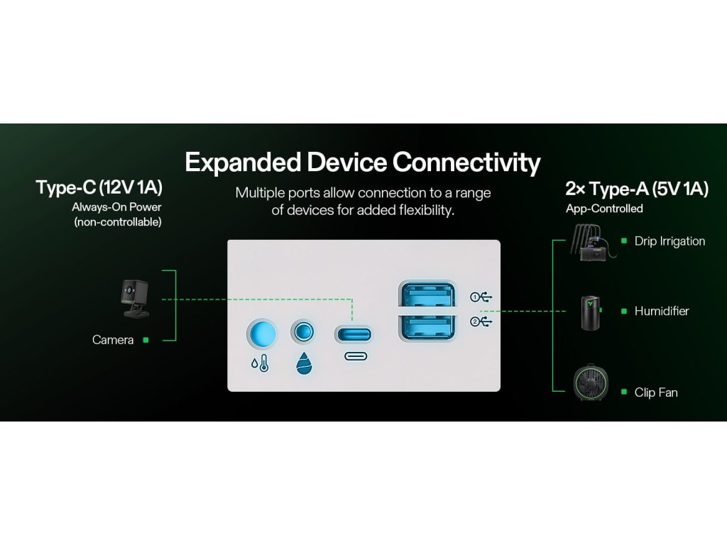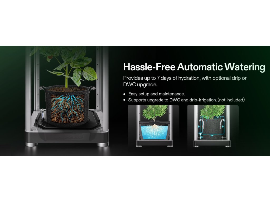 - Nádrž: 6 l (samo-zavlažování, možnost upgradu na drip/DWC)