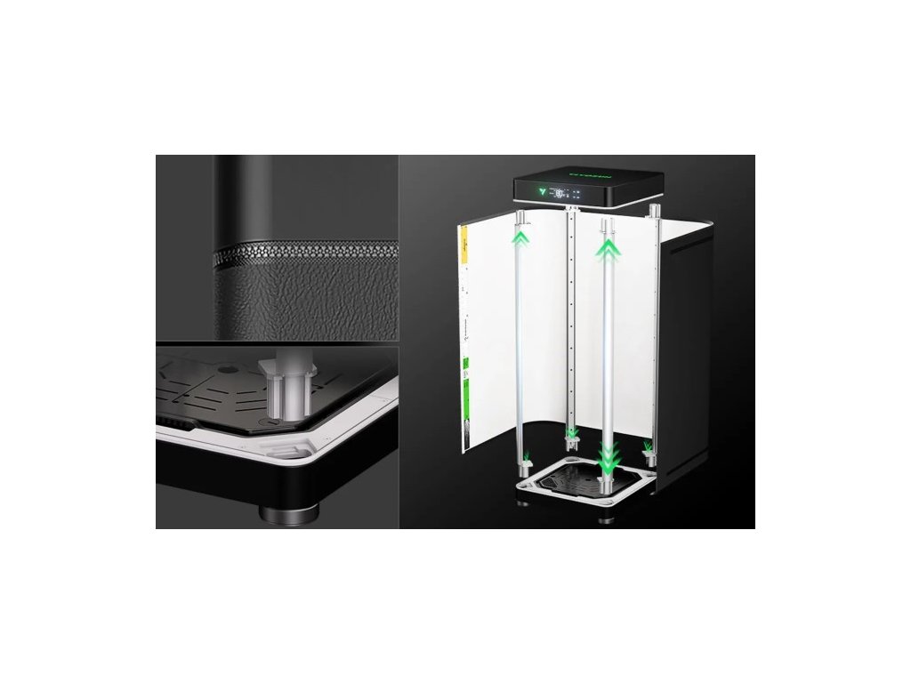 VGrow má integrovanou ventilaci a uhlíkový filtr. Na produktové stránce výrobce uvádí až 99% eliminaci zápachu a patentovanou vícevrsstvou cirkulaci vzduchu. Pro dlouhodobý výkon je potřeba pravidelná údržba filtru.