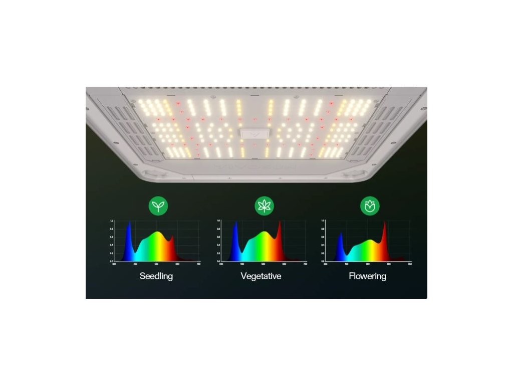 Box má nastavitelné spektrum pro různé fáze růstu (seedling/veg/flower). Ve fázi květu je spektrum cílené i na červené a far-red vlnové délky (660 nm a 730 nm) pro podporu kvetení.